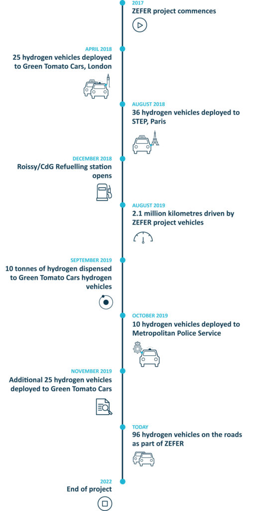 ZEFER started in September 2017 and will run until September 2022. The project will deploy 180 FCEVs (Fuel Cell Electric Vehicles) in Paris, London and Brussels. It will demonstrate the viable business cases for captive fleets of FCEVs in operations which can realise value from hydrogen vehicles.